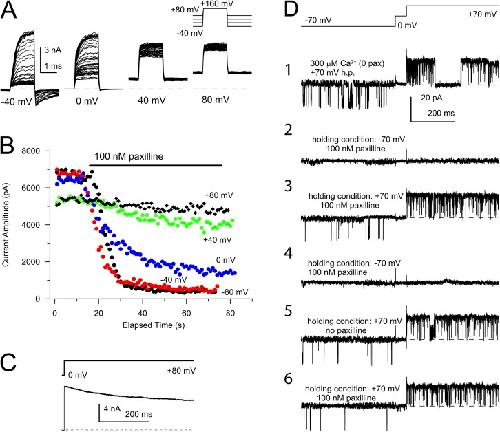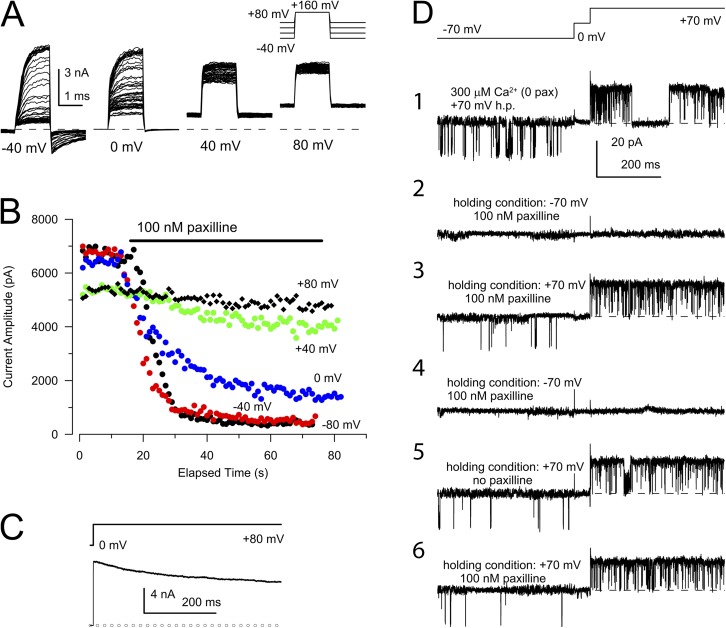 Figure 3. Paxilline inhibits channels at conditions of low Po, but not under conditions of high Po. (A) An inside-out patch bathed with 300 µM Ca2+ was initially held at −80 mV. The patch potential was then stepped to holding potentials of −40, 0, 40, and 80 mV (from left to right), and 1.6-ms steps to 160 mV were used to monitor available BK current, while 100 nM paxilline was applied after the 10th step at a given holding potential. Paxilline was washed out and full recovery from block was obtained between tests at different holding potentials. At the most negative potentials, block is substantial, whereas at 40 and 0 mV, there is little development of block. (B) The peak outward current from the traces in A is plotted as a function of elapsed experimental time. (C) The time course of reduction of current during sustained depolarization to 80 mV is shown, establishing that the reduction of current at the positive holding potentials (B) does not reflect paxilline block, but an intrinsic slow reduction in BK conductance with prolonged depolarization. (D) All traces are from the same single-channel patch, stimulated with the protocol shown on the top. The patch was constantly exposed to 300 µM cytosolic Ca2+. (1) Control activity in the absence of paxilline. (2) The holding potential was changed to −70 mV, and 100 nM paxilline was applied. The trace was taken after 30 s in paxilline. (3) The trace was taken ∼30 s after the patch had been returned to 70 mV while in the constant presence of 100 nM paxilline. (4) The trace was taken ∼30 s after the patch was again returned to −70 mV while in paxilline. (5) The trace was obtained after washout of paxilline while holding the patch at 70 mV. (6) The trace was taken ∼30 s after 100 nM paxilline was applied while holding at 70 mV. |
