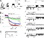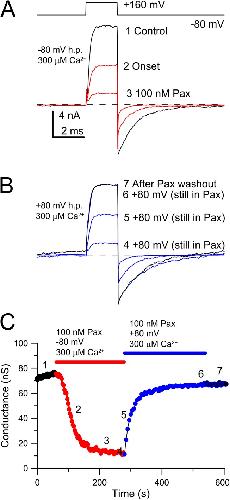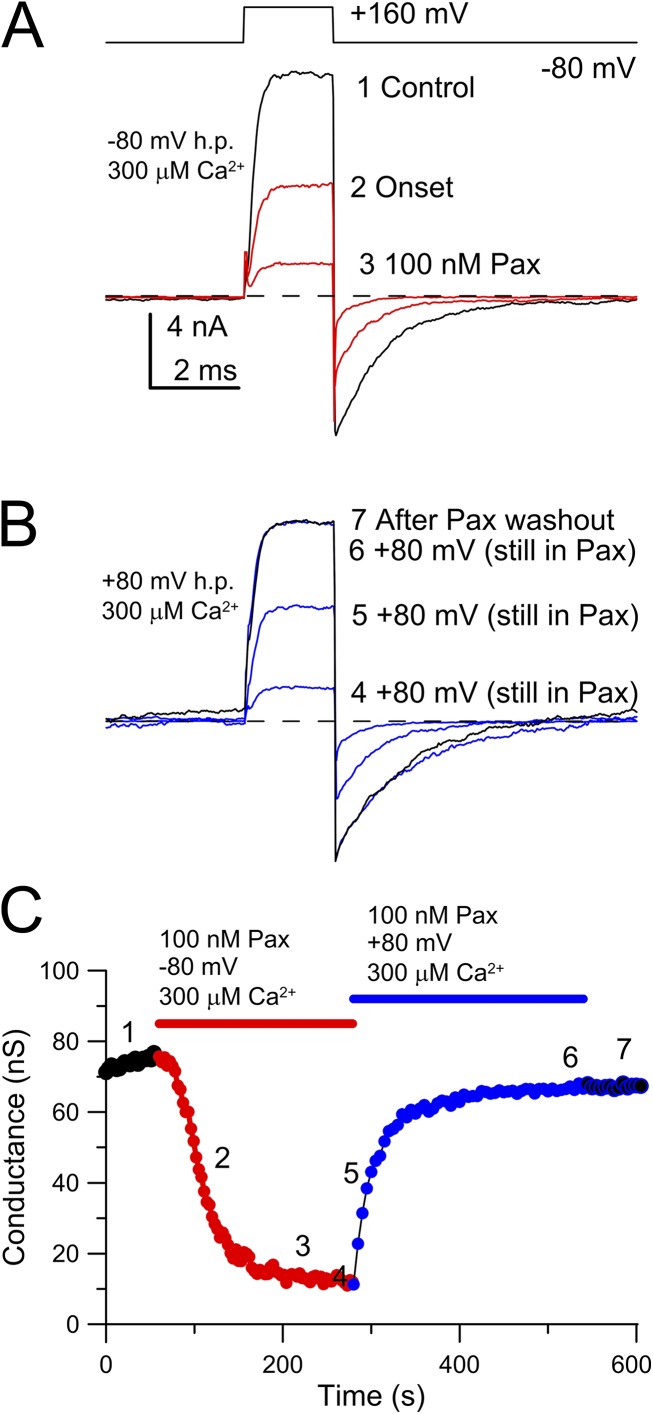 Figure 4. Essentially complete recovery from paxilline block can occur, even in the continuous presence of paxilline under conditions of high Po. (A) The indicated test-pulse sequence was applied every 1 s while holding at −80 mV with 300 µM Ca2+. The traces show before paxilline application, after ∼50% inhibition by paxilline, and during the full paxilline effect. (B) For the same patch in A, the equilibration conditions were altered to 80 mV with 300 µM Ca2+ while still in the continuous presence of 100 nM paxilline. Brief sojourns to −80 mV with test steps to 160 mV were used to monitor recovery in the presence of paxilline. A 60-s washout of paxilline confirmed that no additional recovery occurred. (C) The time course of onset and recovery from inhibition by 100 nM paxilline, while in the continuous presence of paxilline, is plotted for the cell shown in A and B, with the numbers corresponding to the approximate times of the traces in A and B. |