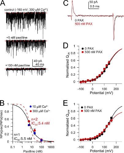 Figure 5. Paxilline reduces NPo at conditions where voltage sensors are largely inactive, and does not influence the voltage-sensor equilibrium. (A; top) The trace shows example channel activity at −80 mV and 300 µM Ca2+ for a macropatch with many channels. 4-ms steps to 100 mV (not depicted) were also used to monitor paxilline inhibition. (Middle and bottom) These traces show activity under the same conditions but with 5 and 100 nM paxilline, respectively. NPo was determined from activity at −80 mV. (B) The NPo measured in paxilline for 3 s of activity normalized by the NPo measured in the absence of paxilline is plotted as a function of paxilline. The solid line corresponds to a fit of NPo(pax)/NPo=11+([PAX]IC50)n, with IC50 = 5.5 ± 1.1 nM with n = 1. Red dotted line corresponds to a fit of the same function with n = 2. (C) Gating currents measured with an activation step to 160 mV from −80 mV with 0 µM Ca2+ are shown in the absence and presence of 500 nM paxilline. (D) The Qon integrated over 1 ms for steps to the indicated potentials are plotted for control and 500-nM paxilline solutions. Fitted lines correspond to: without paxilline, z = 0.56 ± 0.050 e with Vh = 137.6 ± 14.3 mV; with paxilline, z = 0.54 ± 0.025 e with Vh = 131.4 ± 2.1 mV. (E) Qoff is plotted as a function of previous command potential for 0 and 500 nM paxilline. Without paxilline, z = 0.66 ± 0.07 e with Vh = 142.7 ± 14.3 mV; with paxilline, z = 0.56 ± 0.035 e with Vh = 130.2 ± 9.1 mV. |