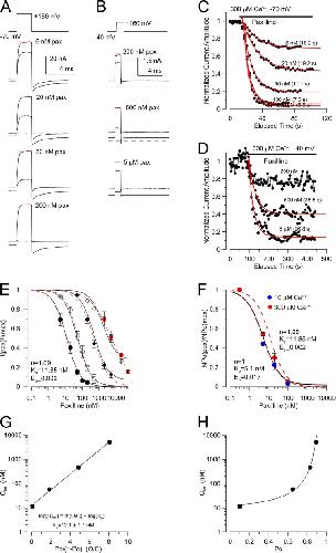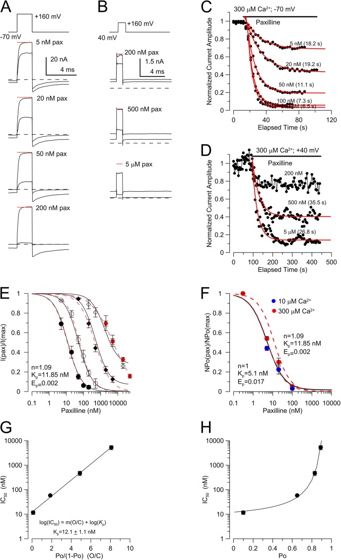 Figure 6. Concentration dependence of paxilline inhibition at four different conditions of channel Po. (A) Traces show currents activated by brief steps to 160 mV under equilibration conditions of −70 mV and 300 µM Ca2+ with 5, 20, 50, and 200 nM paxilline. Red line shows the identical level of peak current for each paxilline test. (B) Traces show currents activated by steps to 160 mV under equilibration conditions of 40 mV and 300 µM Ca2+ for 200 nM, 500 nM, and 5 µM paxilline, all from the same patch. (C) The onset of inhibition of current activated at 160 mV with 300 µM Ca2+ at −70-mV equilibration condition from traces as in A is shown for five paxilline concentrations along with single-exponential fits (red). (D) Onset of inhibition with single-exponential fits (red) is shown for the higher Po equilibrium condition (B). (E) The fraction of unblocked BK current is plotted as a function of paxilline for four different equilibration conditions (−70, 0, 40, and 70 mV, all with 300 µM Ca2+) from experiments as in A and B. Dotted red lines correspond to fits of a Hill function, with IC50 values of 11.7 ± 1.9 nM, 58.4 ± 2.9 nM, 469.8 ± 94.9 nM, and 5.37 ± 1.0 µM, from left to right. Solid lines correspond to the fit of Scheme 1, with Kp = 11.85 nM and Ep = 0.002, with n = 1.09. (F) The inhibition of NPo at −80 mV and either 10 or 300 µM Ca2+ is displayed from Fig. 5 B, with the dotted red line corresponding to the best fit from Scheme 1 (E) (Kp = 11.85 nM). (G) IC50s from E are plotted as a function of O/C and fit with log(IC50) = m(O/C) + log(Kcp), where m (0.33 ± 0.02) is the slope of the relationship and Kp (12.1 ± 1.1 nM) is the extrapolated IC50 with all channels closed. This provides a model-independent estimate of paxilline inhibition of closed channels. (H) IC50 estimates are replotted as a function of Po along with the fit in F. The extrapolation of the line to Po of ∼1 provides a model-independent estimate of paxilline inhibition of open channels. |