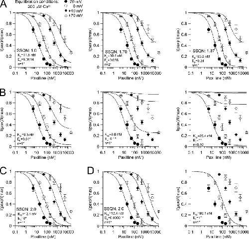 Figure 7. Paxilline stabilizes closed states with only weak, if any, binding to open states. (A) Curves of concentration-dependent inhibition of BK current at four equilibration conditions were fit with Scheme 1, with the assumption that the current activated at positive potentials reflects channels initially either in C, O, or OB, i.e., any open channels with bound paxilline are conducting. Each panel from left to right corresponds to fits with Scheme 1 (Eq. 7) in which either one, two, or four paxilline molecules can bind to inhibitory positions. Best-fit values are given in the figure. The model with n = 1 best accounts for the shape of the inhibition by paxilline. (B; left) Scheme 1 was again used, while constraining Ep to 0.01 (left), 0.1 (middle), or 1.0 (right), showing that increasing open-state affinity fails to account for the data. Right-hand panel corresponds to state-independent paxilline interaction with C and O. (C) Ep was set to 0, thereby approximating strictly closed-channel block. (D) Data were fit with Scheme 3 (Eq. 3) in which the paxilline-bound open state is nonconducting. On the left, the value for Ep drifted toward 0, similar to a strictly closed-channel block situation. On the right, Ep was set to 1 (state-independent binding of paxilline). SSQN in A and C corresponds to the sum-of-squares for a given fit normalized to the sum-of-squares for the left panel in A. |