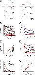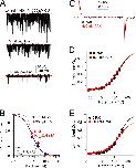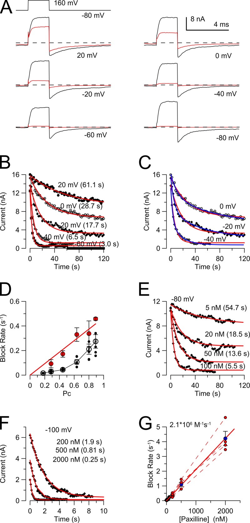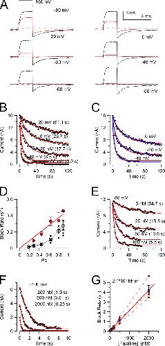 Figure 9. Paxilline inhibition is faster at higher closed-channel probabilities. (A) All traces were obtained from the same patch with the indicated voltage protocol while in the continuous presence of 100 nM paxilline and 300 µM Ca2+. Black traces correspond to currents activated after a re-equilibration period at 80 mV (with 300 µM Ca2+), whereas red traces are the final trace after a change to a new equilibration voltage (as indicated). (B) The onset of current inhibition from the examples in A is plotted as a function of time at the new equilibration potentials. Red lines are single-exponential fits to the onset of inhibition. (C) Onset of inhibition at intermediate Pc is better fit with two (blue) exponential components than one (red). (D) The rate of block (means, SEMs, and individual estimates) from experiments as in B is plotted as a function of Pc, with Pc calculated from the G-V curves at 300 µM Ca2+. Closed red symbols correspond to the faster rate resulting from the fit of either one or two exponential components to the onset time course in B and C. (E and F) Onset of inhibition at −80 mV (E) and −100 mV (F) is shown for different paxilline concentrations along with single-exponential fits. (G) Blocking rate is plotted as a function of [paxilline]. The fitted red line has a slope of 2.1 × 106 M−1s−1. Each dotted line connects determinations at different [paxilline] for single patches. |