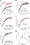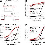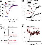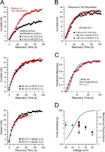 Figure 10. Recovery from paxilline inhibition is faster at higher Po. (A) Unblock time constant from washout of paxilline is comparable to unblock during change in equilibration conditions. The panels are all from the same patch, with the unblocking time course examined at 0 (top), 40 (middle), or 80 mV (bottom). Black symbols and fitted line correspond to unblock in the constant presence of 100 nM paxilline after a change in equilibration condition from −80 mV, 300 µM Ca2+ to each of the three voltages. Red symbols and fitted red lines correspond to washout of paxilline at the indicated voltage with 300 µM Ca2+. BK availability was assessed with brief test steps to 160 mV. Po during the recovery conditions was estimated from G-V curves as 0.7 (0 mV, top), ∼0.85 (40 mV, middle), and ∼0.9 (80 mV, bottom). (B) Recovery time course was compared in the same patch for washout of paxilline at 0 (Po of ∼0.7), −40 (Po of ∼0.4), and −80 mV (Po of ∼0.1), all in 300 µM Ca2+. (C) Recovery time course from A (middle) for washout of paxilline is plotted on a logarithmic scale along with fits of an exponential of form I(t) = (1 − exp(−t/tau)n, for n = 1, 2, or 4. (D) Open circles show recovery time constants for patches examined as in A, with closed symbols corresponding to time constants measured during paxilline washout, and open circles corresponding to the constant presence of paxilline, with each point reflecting the mean of at least four patches. Closed diamonds correspond to time constants measured as in B. The fitted G-V curve (Vh = −34.0 mV; z = 0.98) for currents activated in the patches in A and B is shown to highlight the extent of changes in fractional activation for the different recovery conditions. Red symbols correspond to seven patches for which recovery was measured at 0 mV in the constant presence of either 100 nM paxilline (red square) or 20 nM paxilline (red circle). |