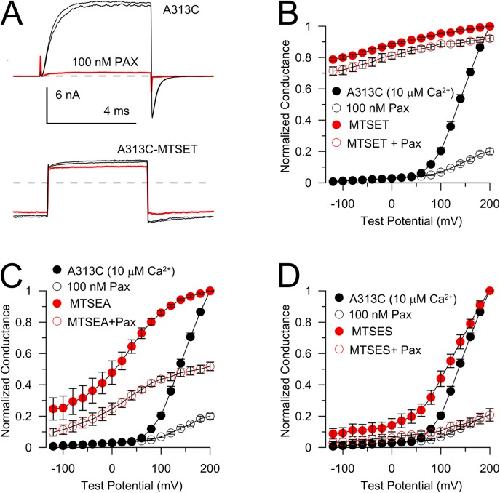 Figure 11. Manipulation of BK Po by MTS modification of S6 residues also modulates paxilline sensitivity. (A) Traces on the top show that 100 nM paxilline readily blocks Slo1-A313C currents, but after modification of A313C with MTSET, paxilline produces hardly any block of the residual current. (B) The normalized conductances from the experiment shown in A are plotted for A313C in the absence and presence of paxilline, and then after modification by MTSET. Slo1-A313C-MTSET is constitutively active over the potentials examined. (C) Results are shown for Slo1-A313C before and after modification by MTSEA. Modification by MTSEA produces less G-V shift than for modification by MTSET, whereas block by paxilline is also intermediate. (D) Similar results are shown for Slo1-A313C before and after modification by MTSES. MTSES produces only modest shifts in the BK G-V and has little effect on block by paxilline. |