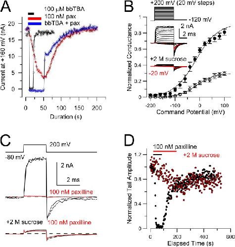 Figure 12. bbTBA and sucrose each slow paxilline inhibition. (A) Blockade of Slo1 current by 100 nM paxilline is displayed with and without simultaneous application of 100 µM bbTBA. The equilibration conditions were 0 mV with 10 µM Ca2+, and BK current availability was monitored by voltage steps to 160 mV applied at 1 Hz. Blocker applications are shown with horizontal bars, with all measurements from the same patch. Block and unblock with 100 µM bbTBA alone (black) is rapid, whereas block by 100 nM paxilline (red) alone exhibits slow onset and recovery. After simultaneous application of paxilline with 100 µM bbTBA, the amount of paxilline inhibition is reduced about half. (B) BK currents were activated with 300 µM Ca2+ with the indicated voltage protocol without and with the addition of 2 M sucrose to the cytosolic solution. Insets show currents with a red trace at −20 mV. Sucrose markedly reduces outward current, whereas tail currents at −120 mV are reduced a little more than half. For control solutions, Vh = −16.3 ± 7.2 mV, whereas with 2 M sucrose, Vh = −12.8 ± 3.3 mV. (C) 100 nM paxilline strongly inhibits BK current, whereas in 2 M sucrose, both outward and inward currents are only slightly affected by paxilline. Top traces are single sweeps. Bottom traces correspond to an average of 15 sweeps before, during, and after washout of 100 nM paxilline. (D) Plot of time course of paxilline inhibition without and with 2 M sucrose suggests that sucrose slows the development of inhibition by paxilline. |