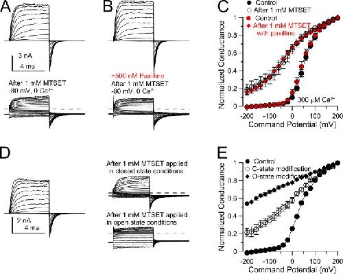 Figure 13. Paxilline does not hinder MTSET modification of A313C. (A; top) The traces show currents activated with 300 µM Ca2+ at voltage steps up to 200 mV for channels arising from Slo1-C430S-A313C. (Bottom) Currents were similarly elicited, but after 120 s of application of 1 mM MTSET while holding the patch at −80 mV with 0 Ca2+. (B; top) The traces show current for Slo1-C405A-A313C activated with 300 µM Ca2+. The patch was then first perfused with 500 nM paxilline for 100 s while holding at −80 mV with 0 Ca2+, and then exposed to 1 mM MTSET with 500 nM paxilline for 120 s while still at −80 mV with 0 Ca2+. (C) G-V curves summarize results from patches examined for conditions shown in A and B. Because MTSET modification was tested both without and with paxilline, two separate sets of control G-V curves at 300 µM Ca2+ are shown. (D) BK currents were recorded in 300 µM Ca2+ before (left) and after (top right) modification by 1 mM MTSET, applied for 120 s in 0 Ca2+ at −80 mV. Modification is similar to that in A. The patch was then held at 0 mV, 0 Ca2+, and then channels were opened by 20 100-msec steps to 160 mV, after which the traces on the bottom right were obtained in 300 µM Ca2+. (E) G-V curves correspond to conditions as in D for control, after closed-state modification by 1 mM MTSET, and then after subsequent open-state modification by the same MTSET solution. |