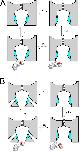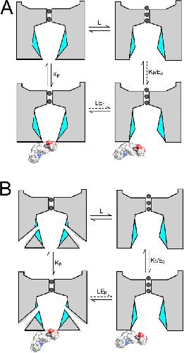 Figure 14. Cartoons describing possible views of inhibition of closed BK channels by paxilline. (A) Schematic BK channels are either closed (left pair) or open (right pair). The channels are diagrammed with an opening at the cytosolic end of the channel, which allows small molecules in and out of the inner cavity. Paxilline occludes the aperture to the inner cavity in the closed BK channel. Binding of paxilline to the closed channel (bottom left) occludes the aperture to the inner cavity. The open conformation either is unable to bind paxilline or does so with low affinity, without any occlusion of ion permeation. Dotted arrows indicate transitions that are either very low probability or do not occur. (B) Overall scheme is the same as in A, except for positions of inner-pore helices along alternative aqueous pathways for access of small molecules to the inner cavity. Thus, occlusion of the closed-channel aperture by paxilline may not impede access of small molecules to the inner cavity, such that MTS reagents can modify position A313C. |