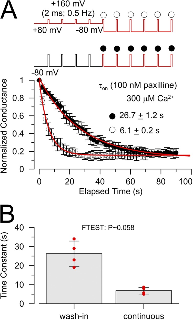 Figure 8. Kinetics of block onset is more reliably estimated by step changes in equilibration conditions while in the constant presence of paxilline rather than by wash-in of paxilline. (A) Onset of paxilline is compared at −80 mV and 300 µM Ca2+ for two situations: first, simple perfusion of 100 nM paxilline over the cytosolic face of the face, and second, a change in equilibration conditions from 80 to −80 mV. Voltage protocols in each case are shown schematically. Available BK current was monitored by a 2-ms step to 160 mV applied at 0.5 Hz. Symbols over the voltage steps for a particular protocol correspond to the particular symbols showing the onset of block as a function of elapsed time, with single-exponential time constants as given. (B) Estimates of time constants from individual patches for each method of assessing paxilline block are shown along with means and STD. Each method was evaluated with the same patches. An F-test provided an assessment of whether variance for each set of estimates was significantly different. |