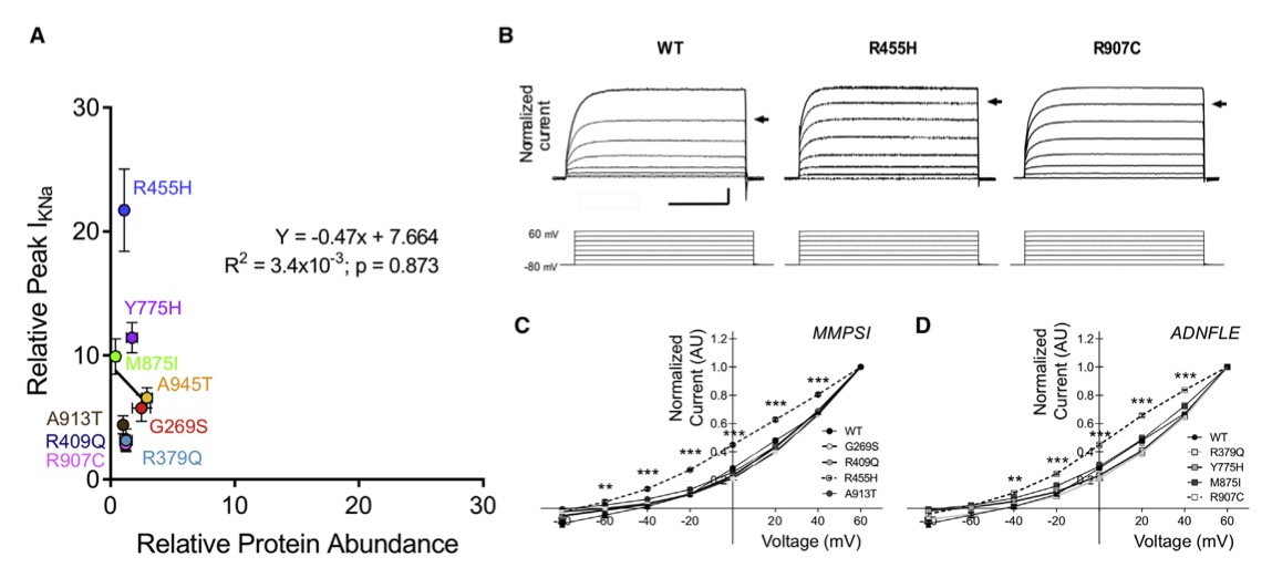 (C and D) Mean peak IKNa at each of the command voltages, shown as an I/V plot for MMPSI (C) and ADNFLE (D) mutants. Current amplitudes were normalized to the peak IKNa at +60 mV in all cases. The increase in relative channel activity was seen at voltages R 60 mV and 40 mV for R455H (C) and R907C (D), respectively (mean ± SEM; **p < 0.01, ***p < 0.001 against WT, two-way ANOVA with Bonferroni’s post hoc test, n = 5–10 for all points).