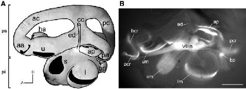 Figure 1. Structure of the inner ear in Xenopus laevis. A: Semi-diagrammatic medial view of a right inner ear based on a stage 52 paint-filled ear, with the location of the sensory organs indicated in black. The three semicircular canals and the utricle comprise the pars superior, whereas the pars inferior consists of the saccule, lagena, amphibian papilla, and basilar papilla. The endolymphatic duct is shown joining the pars inferior, but the extensive dorsal endolymphatic sac is not depicted. B: Whole-mounted medial view of a stage 60 right inner ear with the sensory epithelia labeled using an antiair cell antibody. Branches of the eighth nerve are still attached to the ear and also exhibit fluorescence. For Abbreviations, see list. Scale bar = 0.5 mm in B.