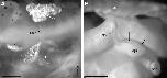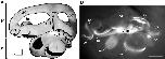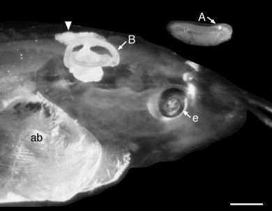 Figure 2. Paint-filled inner ears are shown in intact, fixed Xenopus laevis specimens at stage 28 (A) and stage 52 (B) to demonstrate the location and relative size of the developing ear. Images are lateral views. Inner ears were filled with paint to visualize the inner surface of the membranous labyrinth. The endolymphatic sac is visible in the stage 52 specimen (arrowhead), even though it did not fill with paint (see text). Total length of stage 52 specimen is 25 mm from tip of snout to tip of tail. Scale bar = 1.0 mm.