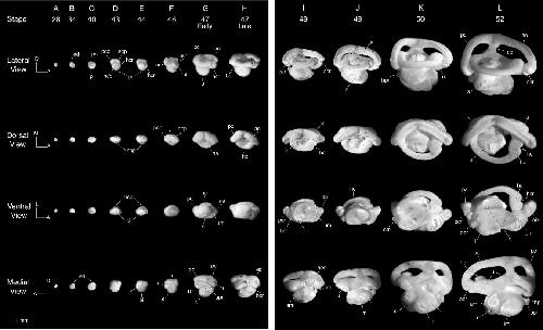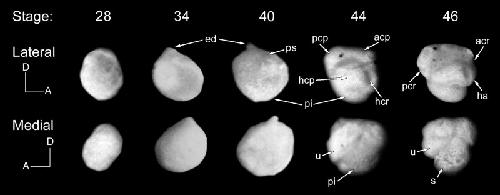 Figure 4. Selected images enlarged from Figure 3. Lateral and medial aspects of ears at early stages reveal the emerging morphologic features of the developing otocyst. Ear images from stages 284 were approximately normalized to the stage 46 images; refer to Figure 3 for accurate size comparisons. For Abbreviations, see list.