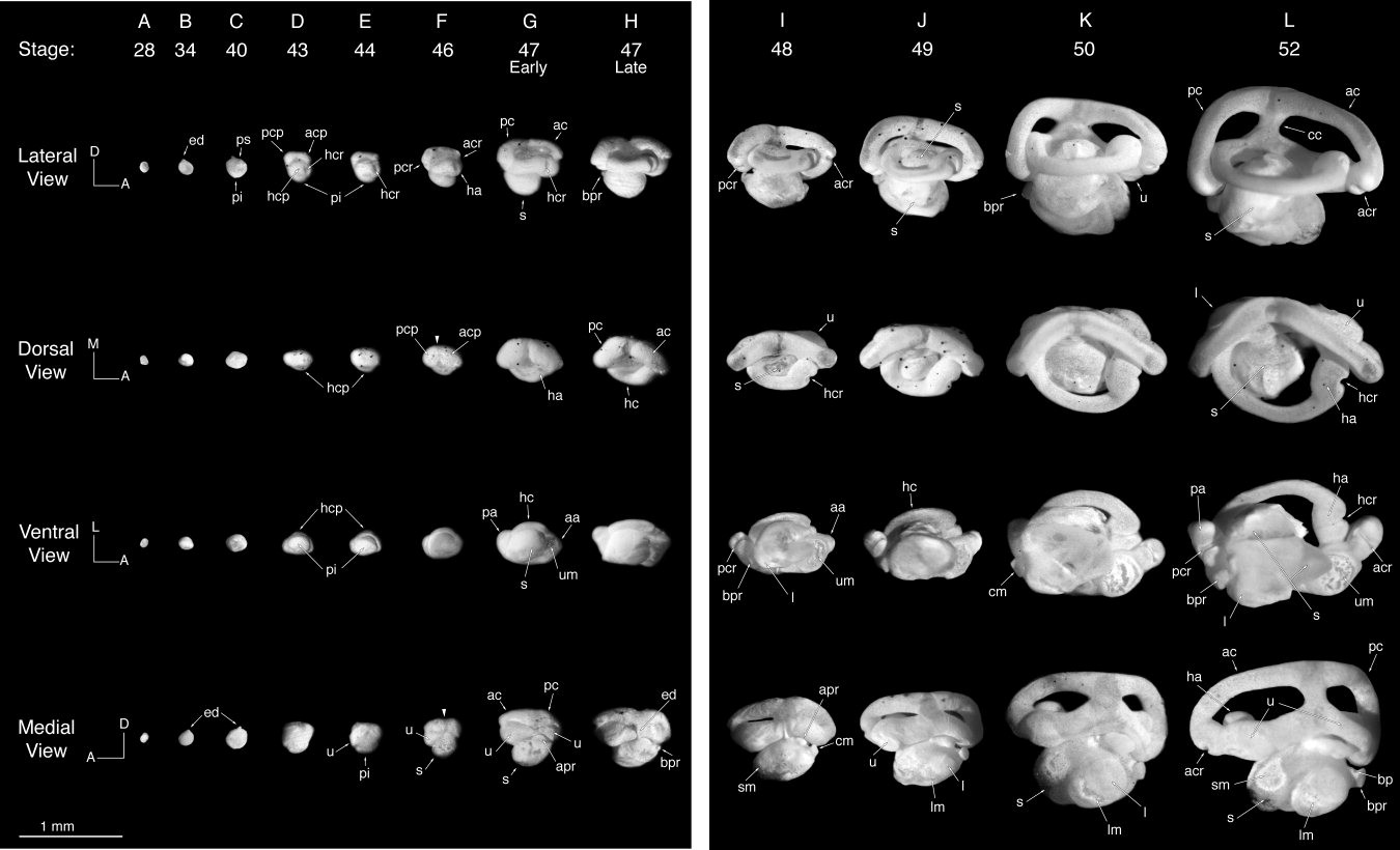 Figure 3. Atlas of the developing Xenopus laevis inner ear. The endolymph-filled spaces of the inner ear were injected with a solution of alkyd paint and imaged to present three-dimensional views of the inner surface of the ear as it develops from stage 28 to stage 52 (staging based on Nieuwkoop and Faber, 1994). All specimens are shown at the same magnification. For Abbreviations, see list. Scale bar = 1 mm.