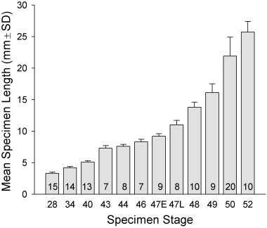 Figure 6. Mean length (tip of snout to tip of tail) of fixed, cleared Xenopus laevis specimens. Staging was based on Nieuwkoop and Faber, 1994 (see Experimental Procedures section), and sample size for each stage is given on the bar. E, early; L, late.