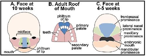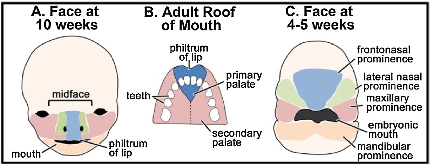 Fig. 3. Overview of orofacial development and primary palate anatomy. (A) Schematic of the human fetal face at 10 weeks of development showing major anatomicalfeatures. The colored domains correspond to the facial prominences in (C) during embryonic development. (B) Schematic of the adult palate showing the location of theprimary verses secondary palate. (C) Schematic of the face of a 4â5 week human fetus showing the location of the facial prominences.