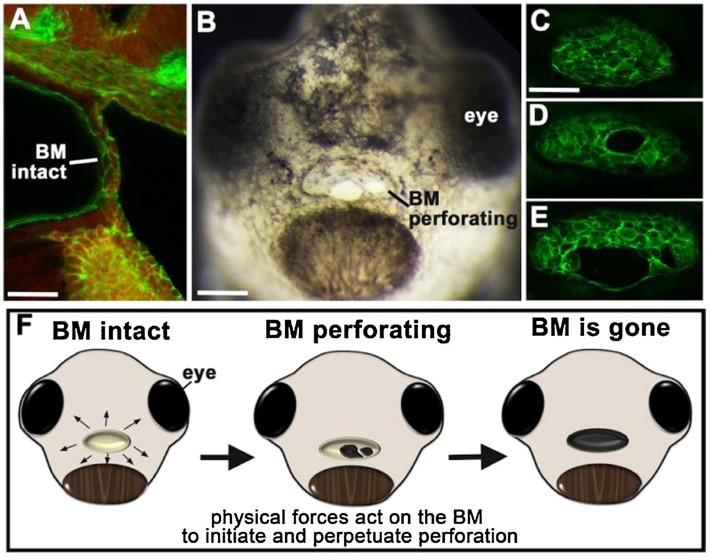 Fig. 2. Buccopharyngeal membrane rupture. (A) Sagital section through the middle of the head showing the buccopharyngeal membrane. Cells are labeled with phalloidin(green) and the red is autofluorescence. Phalloin labels F-actin which is located along membranes of cells. scale bar = 33 m. (B) Frontal view of a face as the buccopharyngealmembrane perforates or ruptures. scale bar = 130 m. (CâE) Frontal views of phalloidin labeled buccopharyngeal membranes before (C) and during (D,E) perforation. scalebar = 80 m. F Schematic of embryonic faces at stage 40, showing the stages of buccopharyngeal membrane rupture and presenting the hypothesis that biomechanical forcesare important for this process. Abbreviations: BM; buccopharyngeal membrane.