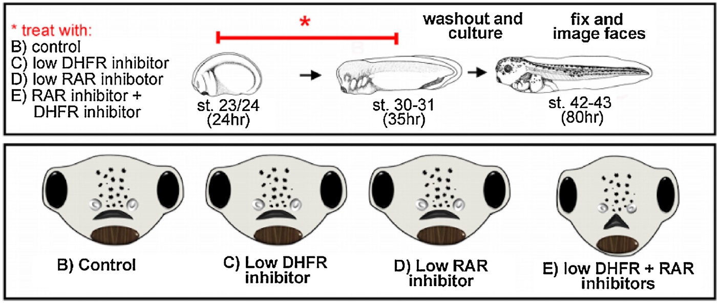 Fig. 5. Retinoic acid-folate interaction. (A) Schematic showing the experimental design to test for an interaction between folate and retinoic acid using inhibitors. (B)Schematics of embryonic faces summarizing the results of the experiment outlined in A. Low concentration of inhibitors on their own had no effect on facial morphology.However, when these inhibitors were combined, a median cleft could be observed.