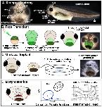 Fig. 1. Xenopus techniques for orofacial research. (A) Frontal and lateral views of Xenopus at stage 40. (B) Schematic showing the steps in performing a face transplant.Orofacial tissue is removed from a donor injected embryo and transplanted to the same region of sibling un-injected embryo. (C) Schematic showing the steps in performinga face explant. Tissue is excised from the head and plated on a fibronectin coated glass bottom dish. (D) Schematic showing a representative example of morphometricanalysis of the orofacial region in Xenopus. Landmarks are assigned coordinates which are then used to perform a canonical variate analysis. This analysis can statisticallyseparate landmark locations from a normal and morphant (or chemically treated) embryo which can then be presented graphically or on a transformation grid.