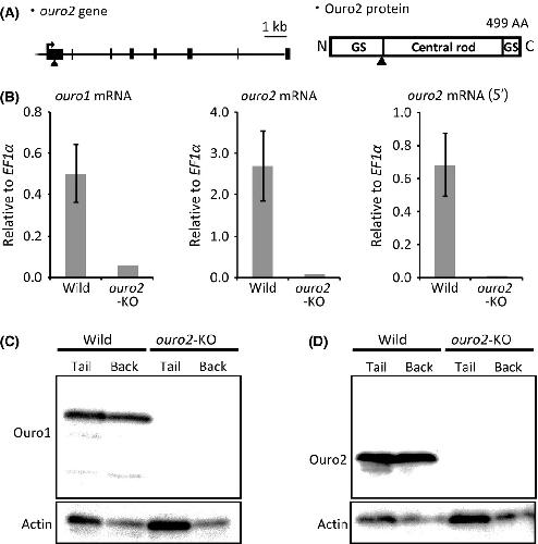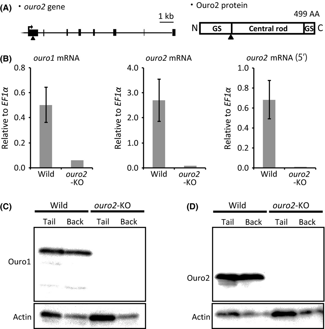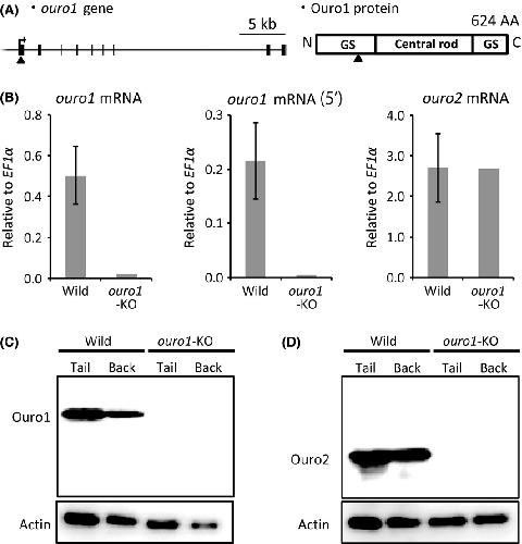Figure 2. Characterization of the ouro1-knockout tadpole. (A) The target sites (arrowheads) of anti-ouro1 TALEN in ouro1 genomic gene and Ouro1 protein. The black boxes and the arrow indicate exons and the transcriptional direction, respectively. (B) Expression levels of ouro1 and ouro2 mRNA in the tailskin of stage 60 wild-type and ouro1-knockout tadpoles. Levels of ouro1 mRNA were determined using a pair of primers downstream and another pair of primers (5â²) upstream of the TALEN target sites. Data from wild-type tadpoles are expressed as the means ± SEM (N = 6). (C, D) Expression levels of Ouro1 (C) and Ouro2 (D) proteins in the tail and back skin of stage 60 wild-type and ouro1-knockout tadpoles.