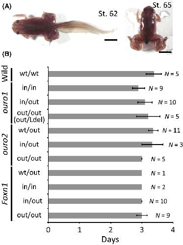 Figure 5. Tails regressed in ouro1-, ouro2- and Foxn1-knockout tadpoles similarly to wild-type tadpoles. (A) Photographs of wild-type stage 62 and 65 tadpoles. Scale bars = 5 mm. (B) The time required for wild-type tadpoles and ouro1-, ouro2- and Foxn1-knockout tadpoles to develop from stage 62 to 65. Data are expressed as the means ± SEM. wt, wild-type; in, in-frame mutation; out, out-of-frame mutation; Ldel, a large deletion.