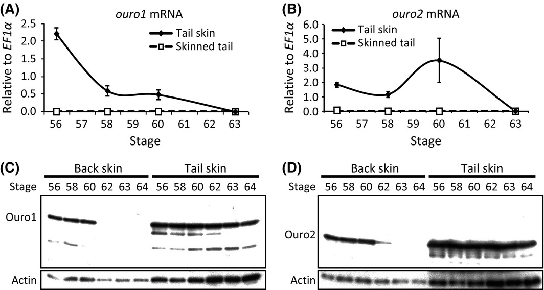 Figure 1. Developmental expression of ouro1 and ouro2 mRNA and proteins during Xenopus tropicalis metamorphosis. (A, B) The expression levels of ouro1 mRNA (A) and ouro2 mRNA (B) in tail skin (solid line) and skinned tail (dotted line) from stage 56 to 63. Data are expressed as the means ± SEM (N = 3–6). (C, D) Western blots showing the expression levels of Ouro1 protein (C) and Ouro2 protein (D) in back and tail skin from stage 56 to 64.