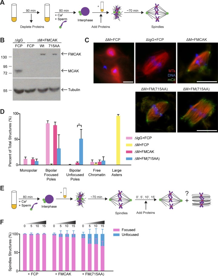 FIGURE 2:. Mutations in the far C-terminus of MCAK induce spindles with unfocused poles. (A) Xenopus egg extracts were mock depleted or depleted with anti-MCAK antibodies and cycled into interphase. The extracts were reconstituted with 100 nM FCP, FMCAK, or FM(715AA) and cycled back into mitosis, and spindles were assembled. (B) Western blot of the depleted extracts reconstituted with the indicated proteins and probed with either anti-MCAK (top) or anti-tubulin (bottom). (C) Representative images from each depletion/add-back experiment. Note the different scale bar on ΔM+FCP. Scale bars, 20 μm. (D) Quantification of the percentage of total structures. Data represent mean ± SD (n = 3; 100 structures counted/per experiment). *p < 0.05. (E) Spindles were assembled in cycled Xenopus egg extracts for 60–70 min, and 100 nM FCP, FMCAK, or FM(715AA) was added to preformed spindles and incubated for 0, 5, 10, or 15 min. (F) Quantification of the percentage of total structures. Data represent mean ± SD (n = 4).