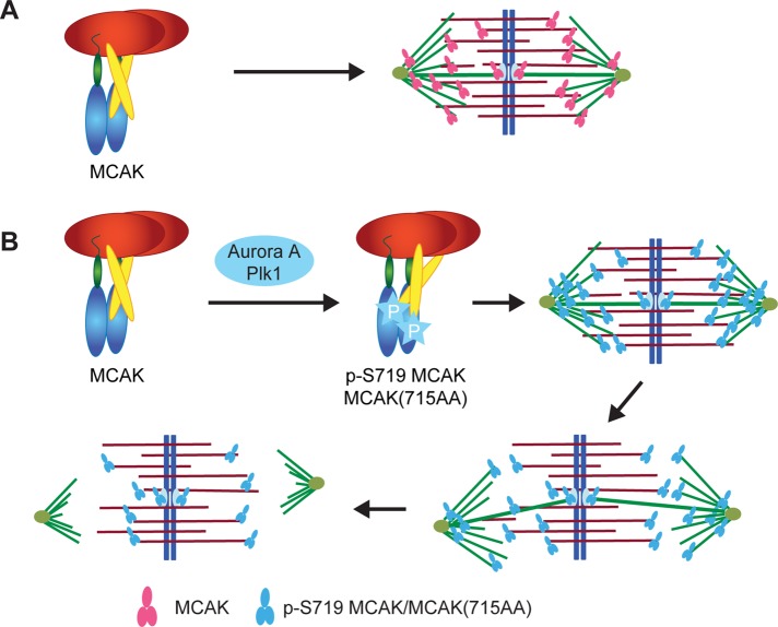 FIGURE 8:. Model for how the MCAK conformation alters subspindle targeting and generates spindles with unfocused poles. (A) MCAK displays a closed conformation in solution and is localized to kinetochores, spindle poles, and plus tips of MTs. (B) MCAK conformation is modulated through phosphorylation at S719 by either Aurora A or Plk1 kinase. E715A/E716A mutation in the far C-terminus of MCAK mimics this conformational change, resulting in a more “closed” conformation that brings the CT closer to the NT. This altered conformation of MCAK causes increased localization at the polar regions, which shortens MTs and reduces MT growth from the poles. Reducing MT length and number at the pole disrupts the polar array or may decouple the MT polar array from the barrel array, leading to spindles with unfocused poles.