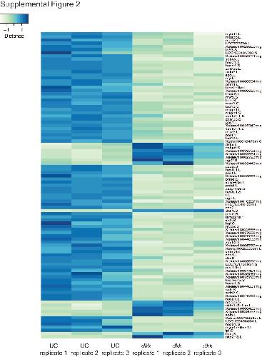 Heatmap of normalized counts for all differentially expressed genes (DE) between three single uninjected control (UC) and three dkk-injected embryos. Gene names are from X. laevis annotation v1.8