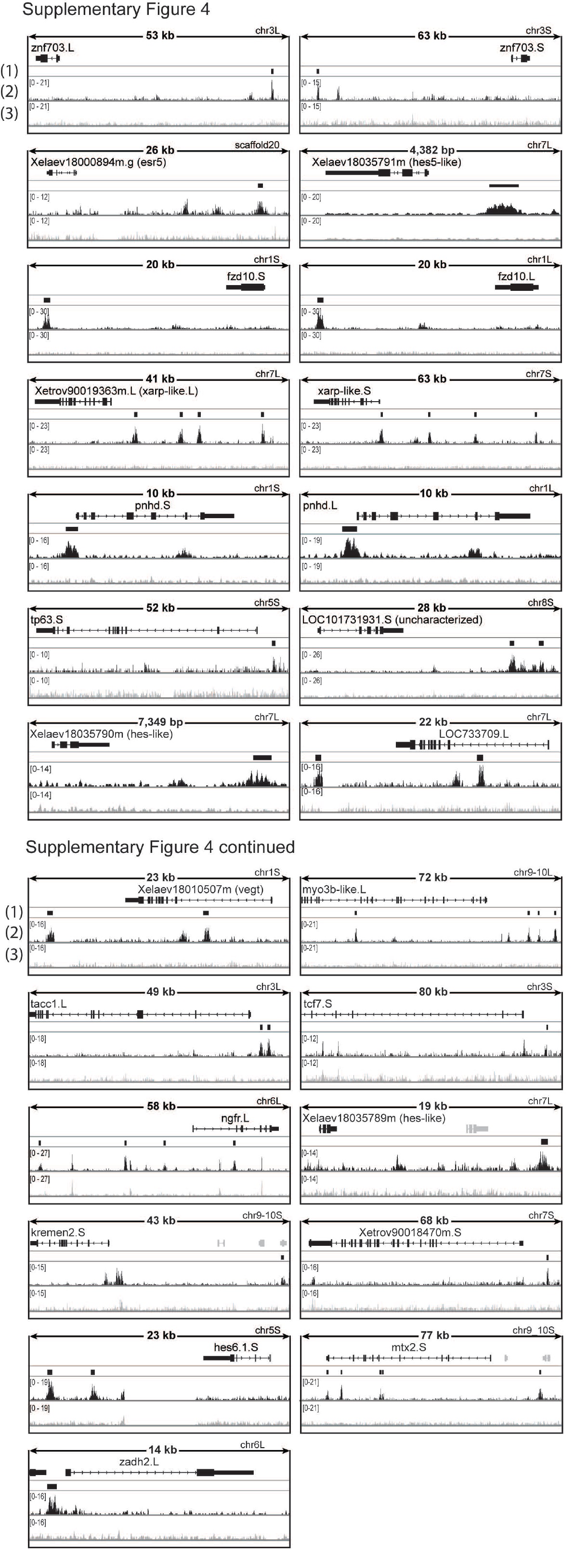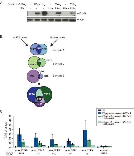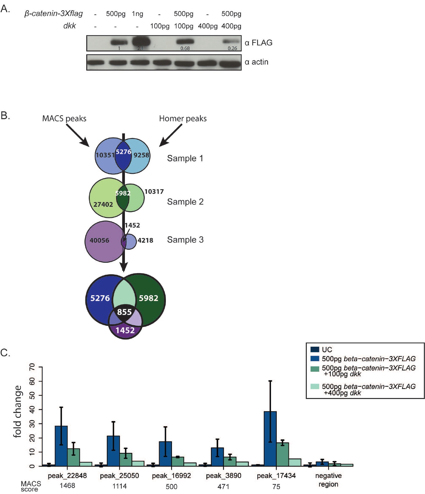 (A) Western blot of embryos injected with mRNA encoding triple FLAG-tagged β-catenin either alone or with increasing amounts of dkk. Numbers bellow FLAG blot represent relative abundance of FLAG epitope compared to abundance in embryos injected with 500pg triple FLAG-tagged β-catenin. Numbers are normalized to the amount of actin loading control detected in the same blot. (B) Number of peaks called by MACS and Homer peak callers. Final peak set was selected by taking the intersection from both peak callers for each sample and then the intersection of all three samples. (C) Chromatin Immunoprecipitaion (ChIP) followed by qPCR using uninjected control (UC) embryos or embryos injected with 500pg triple FLAG-tagged β-catenin either alone or with dkk. Primers were designed to amplify the central region of selected peaks. The negative region is 10 kb from peak_16965. MACS peak score is given for each peak. We note the progressive decline in binding at negative control regions progressively further from the peak, expected from incomplete sonication of chromatin. Values are normalized to input and fold change is taken compared to uninjected control (UC). Error bars are standard deviation.