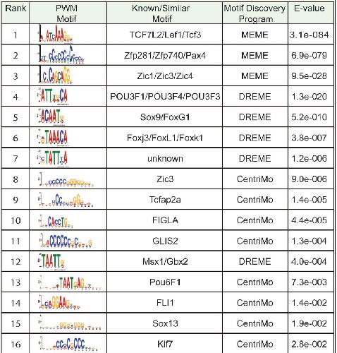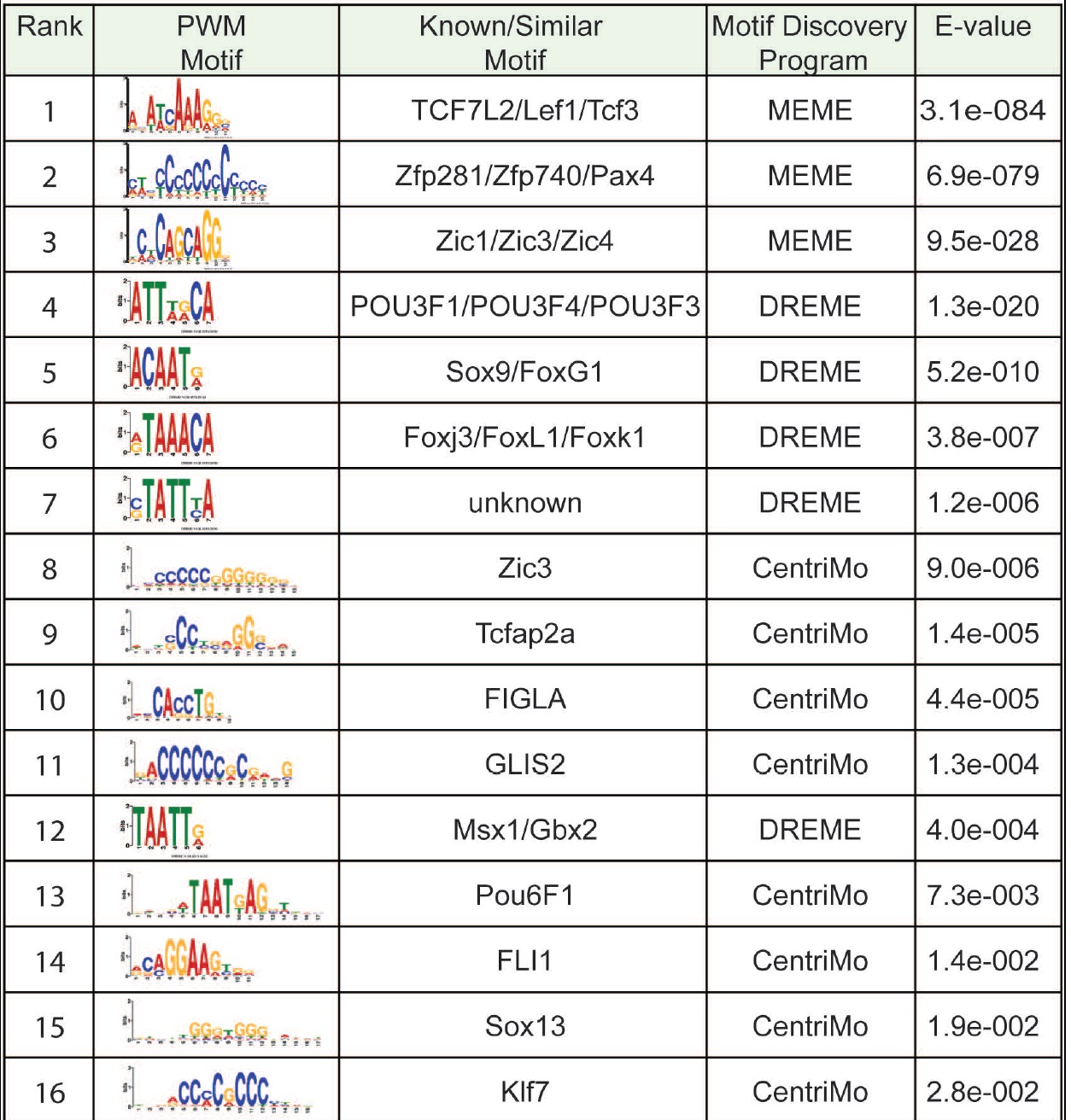 Complete list of motifs found using MEMEChIP (Machanick & Bailey, 2011) ranked by significance. Position Weight Matrix (PWM) of motif discovered, closest known motif, motif discovery program and the E-value are listed.