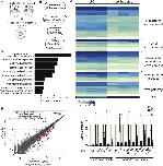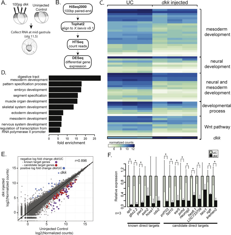 Fig. 1. Expression screen for transcriptional targets of Wnt signaling during gastrulation. (A) Schematic of experiment. 100 pg dkk was injected animally into all blastomeres of 4-cell staged X. laevis embryos. mRNA was extracted from single embryos at stage 11.5 (mid gastrula) and used to make Illumina TruSeq RNA sequencing libraries. (B) Schematic pipeline of RNAseq analysis. (C) Heat map of normalized counts for differentially expressed (DE) genes between three single uninjected control (UC) and three dkk-injected embryos grouped based on categories from GO analysis. (D) Differentially expressed genes were analyzed for enrichment of PANTHER GOslim terms. Fold enrichment is expressed as the observed fraction of genes in GO term category divided by the expected fraction of genes in GO term category. (E) log 2 of normalized counts plotted. Uninjected control (UC) counts on the x-axis and dkk-injected counts on the y-axis. Blue dots have a significant (p-adjustedâ¤0.05) positive log 2 fold change in dkk-injected embryos, purple and red dots have a significant negative log 2 fold change in dkk-injected embryos. The purple dots are known direct target genes of Wnt signaling and the red dots are candidate target genes of Wnt signaling. (F) qPCR data from single embryos in 3 independent experiments validating selected known and candidate target genes (n=3). Error bars indicate standard deviation and significance was calculated by Student's t-test (*p<0.05).