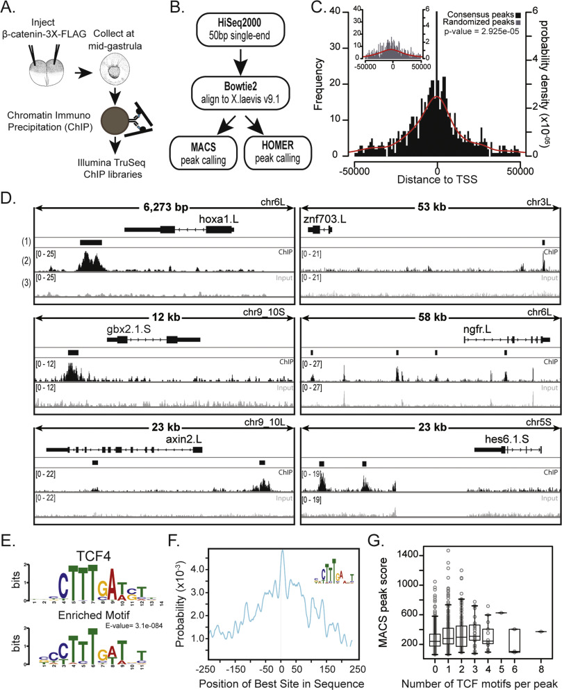 Fig. 2. Chromatin Immunoprecipitation and sequencing (ChIPseq) of a FLAG-tagged β-catenin at mid gastrula identifies β-catenin bound regions. (A) Schematic of experiment. 500 pg of mRNA encoding triple FLAG-tagged β-catenin was injected animally into both blastomeres of a 2-cell stage embryo. Chromatin was crosslinked at mid gastrula, sonicated, and used to make Illumina TruSeq libraries. (B) Pipeline of ChIPseq analysis. 50 bp single-end reads were aligned to X. laevis genome version 9.1 using Bowtie2. Peaks were called with MACS and HOMER. Common peaks were identified by both peak callers in all three biological replicates. (C) Histogram of distances from peak to transcription start site (TSS). Inset: Common peaks were randomly distributed along the genome to make Randomized Peaks (see Section 4). Red line is the probability density for distances. For ChIP peaks the mean distance to TSS=â2929 bp and for randomized peaks the mean distance to TSS=â9131 bp. Samples are significantly different with a p-value=2.925eâ05 (KolmogorovâSmirnov test). Note: Only peaks within 50 kb from TSS are shown. (D) IGV browser views of ChIPseq coverage at previously identified target genes and new candidate targets. (1) The Consensus Peak track shows the consensus peaks from three replicate experiments. (2) Read pile-up coverage from a single ChIPseq replicate sample. We note that the width of the peak displayed depends on the overall length of DNA represented, such that peaks appear narrow in 50 kb windows. (3) Read pile-up coverage from a single Input replicate sample. (E) Peaks were extended by 250 bp from the middle nucleotide and submitted to MEMEchip. Position Weight Matrix of TCF4 motif and most enriched motif found in consensus peaks. E-value=3.1eâ084. (F) Distribution of enriched motif in consensus peaks. (G) Box plot representing number of TCF4 motifs in a peak versus the MACS score (MACS score=â10*log 10 p value) of that peak.
