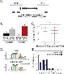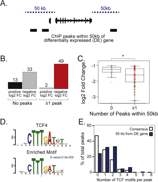 Fig. 3. Candidate Wnt direct target genes have both a negative log2 fold change in dkk-injected embryos and a ChIP peak within 50 kb of the coding DNA sequence. (A) Differentially expressed (DE) genes were designated as candidate direct target genes if they had a ChIPseq peak within 50 kb from the coding DNA sequence (CDS). (B) Number of DE genes that have either no peaks or at least one peak within 50 kb from CDS. (C) Log2 fold change (y-axis) of DE gene plotted as a function of number of peaks within 50 kb (x-axis). Genes that have at least one peak have a significantly greater negative log2 fold change than genes with zero peaks. p<0.05. (D) A TCF motif is enriched in the set of peaks within 50 kb of DE genes as determined by MEMEChIP. E-value=2.5eâ029. (E) Percentage of peaks with TCF motif. Blue is peaks within 50 kb of DE gene; white represents all consensus peaks.