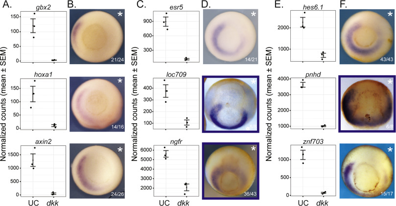 Fig. 5. Expression of Wnt/β-catenin target genes is reduced by dkk-injection. (A, C, E) Normalized counts from RNAseq data comparing uninjected control (UC) and dkk-injected embryos for selected known (A) and candidate (C, E) target genes at stage 11.5 (mid-gastrula). (B, D, F) In situ hybridization showing expression pattern of known (B) and candidate (D, F) target genes. Embryos were injected in the right (asterisk) 2 blastomeres at the 4-cell stage with a total of 100 pg dkk. Blue box indicates that embryo was cleared in either benzyl benzoate:benzoic acid (BB:BA) or benzyl benzoate alone (BB; to reduce transparency and visualize the archenteron). Blastopore view with dorsal up, except pnhd is dorsal view with anterior up.