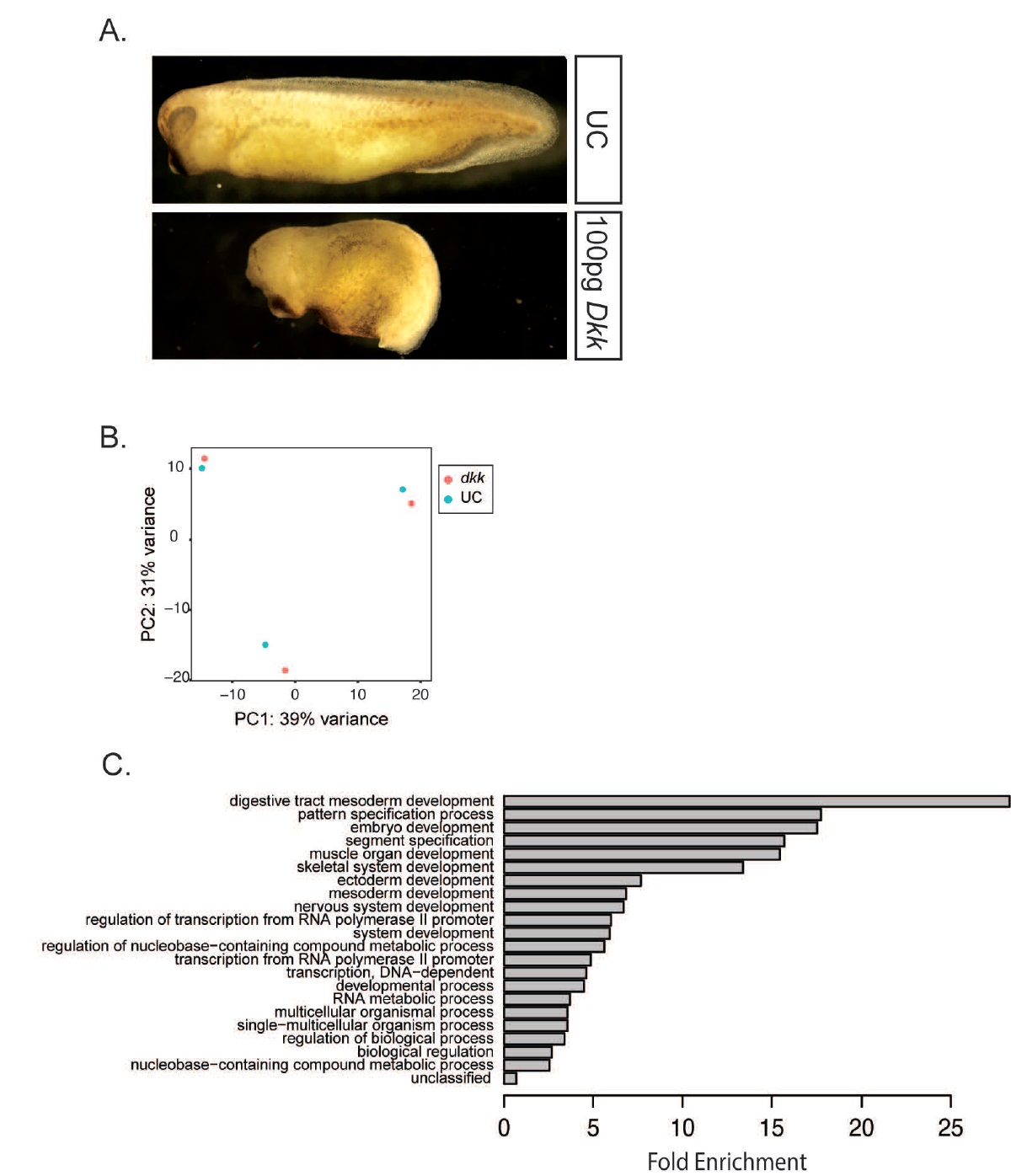 (A) Embryos injected with 100pg dkk have large heads, large cement glands, and a shortened A-P axis. (B) Principle component analysis (PCA) of single uninjected control (UC) or dkk-injected embryos. Embryos segregate according to mating pair, indicating the general similarity of gene expression within that clutch. (C) Full list of PANTHER GOslim terms. Fold enrichment is observed fraction of genes in GO term category divided by expected fraction of genes in GO term category.