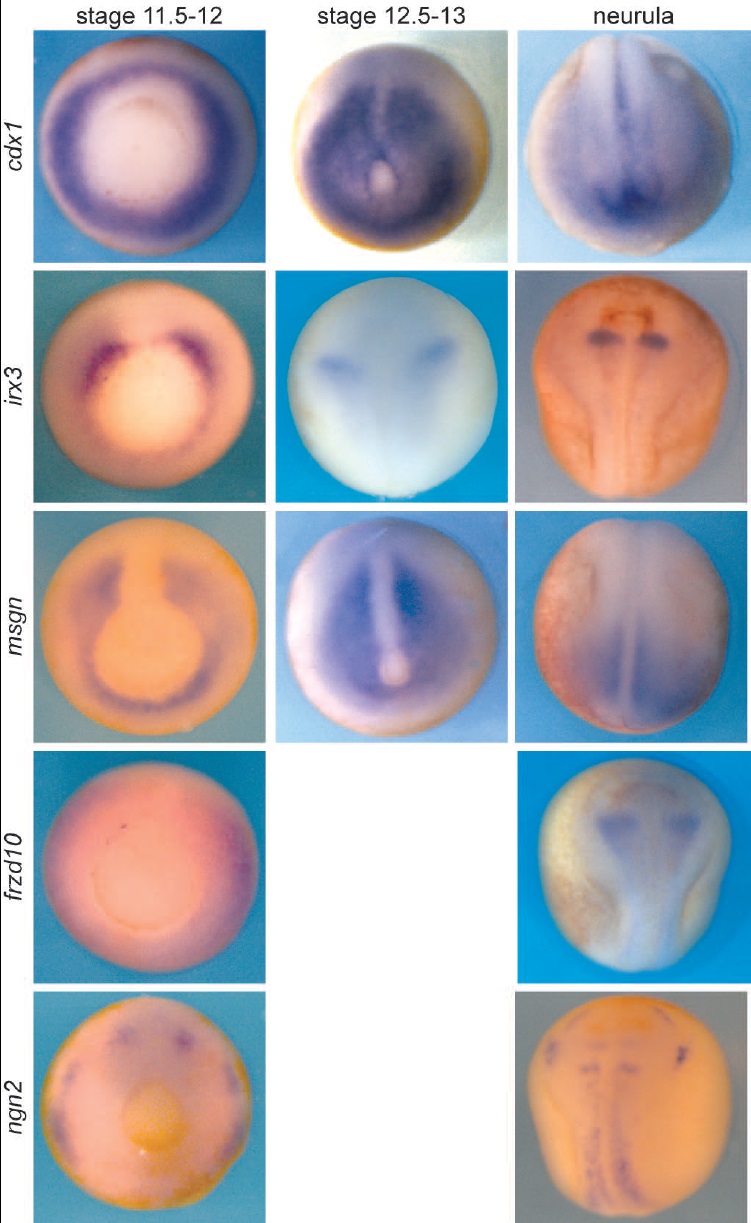In situ hybridization of known (cdx1, irx3, msgn) and candidate (frzd10, ngn2) Wnt/β-catenin target genes. Stage 11.5-12 and 12.5-13 is blastopore view with dorsal up. Neurula stage is dorsal view with anterior up.