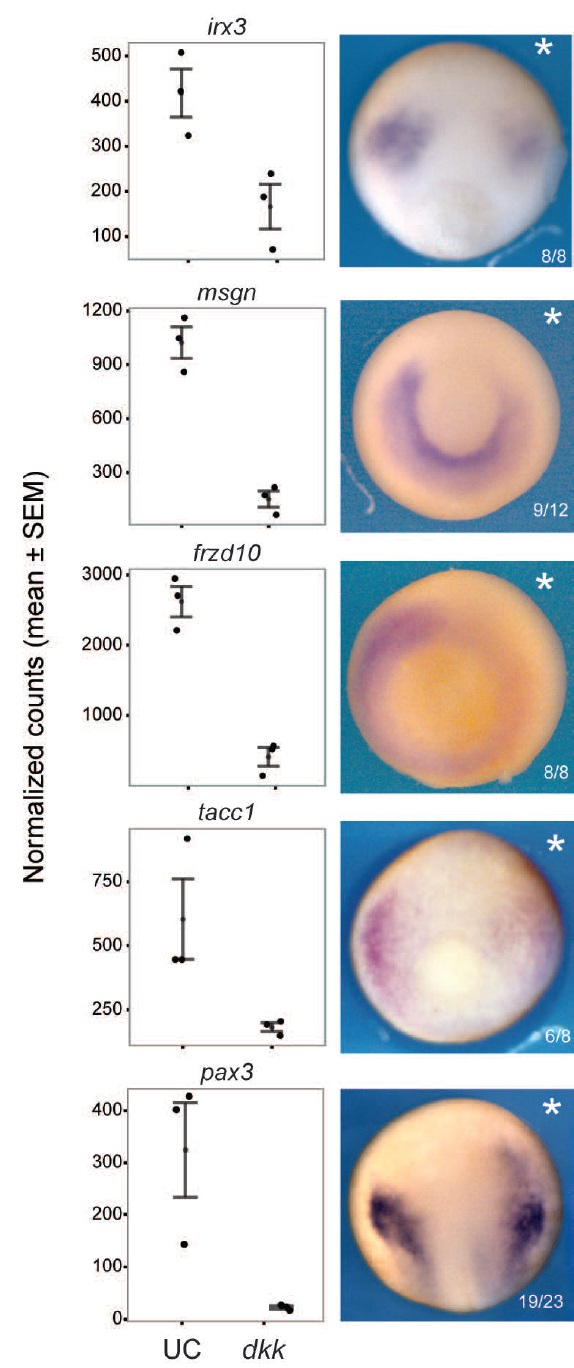 Normalized counts from RNAseq data comparing uninjected control (UC) and dkk-injected embryos and in situ hybridization showing expression pattern. Embryos were injected in the right (asterisk) 2 blastomeres at the 4-cell stage with a total of 100pg dkk.