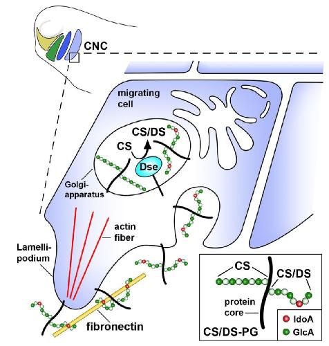 Figure 8. Model for the stimulation of cranial neural crest cell migration by chondroitin/dermatan sulfate proteoglycans in a post-neurula embryo. DS-epi1 converts GlcA into isolated IdoA residues on CS/DS-PGs. The interaction between CS/DS-PGs and extracellular fibronectin stimulates cytoskeletal rearrangement and polarized cell migration. CNC, cranial neural crest; CS, chondroitin sulfate; DS, dermatan sulfate; Dse, DS-epimerase 1; GlcA, glucuronic acid; IdoA, iduronic acid, PG, proteoglycan. |