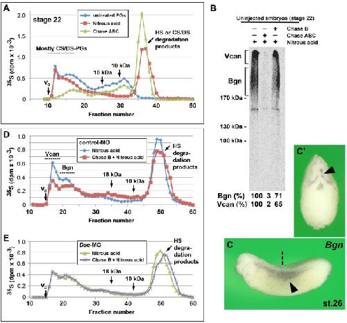 Fig. 3. Presence of IdoA in CS/DS PGs of early embryos. (A) At stage 22, IdoA is present in high molecular mass CS/DS PGs, as demonstrated by the size-fractionation of [35S]-containing PGs. The HS and CS/DS degradation products are produced by nitrous acid and Chase ABC treatment, respectively. CS/DS PGs represent 72% of the high molecular mass PGs (fractions 12-17). (B) SDS-PAGE analysis of [35S]-labeled CS/DS PGs. The same samples analyzed by gel filtration in A were separated using a 4-10% gradient SDS-PAGE following nitrous acid or, alternatively, Chase ABC or Chase B treatments. The fluography indicates CS/DS PGs (brackets) with an apparent molecular mass of 200-300â kDa (Bgn) and â¼1000â kDa (Vcan). The percentages of radioactivity in the framed areas are indicated below each lane. (C,Câ²) Whole-mount in situ hybridization of Bgn at stage 26. Embryo is shown in the lateral view (C) and transversally sectioned (Câ²). Arrowheads indicate migrating trunk neural crest cells. The section planes are indicated by the dashed straight line. (D,E) Chase B treatment degrades CS/DS chains in high molecular mass PGs in control-MO-injected embryos (D) but not Dse-MO-injected embryos (E). Bgn, biglycan; Chase, chondroitinase; Vcan, versican. |