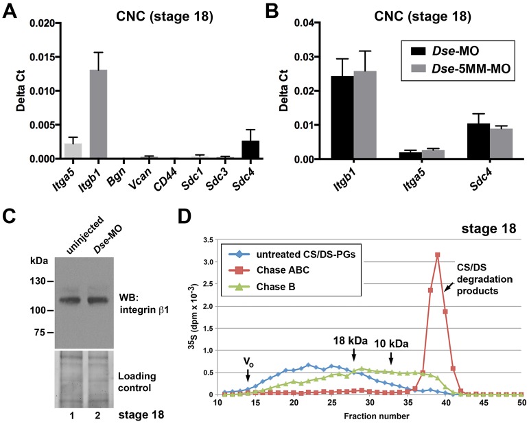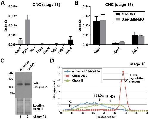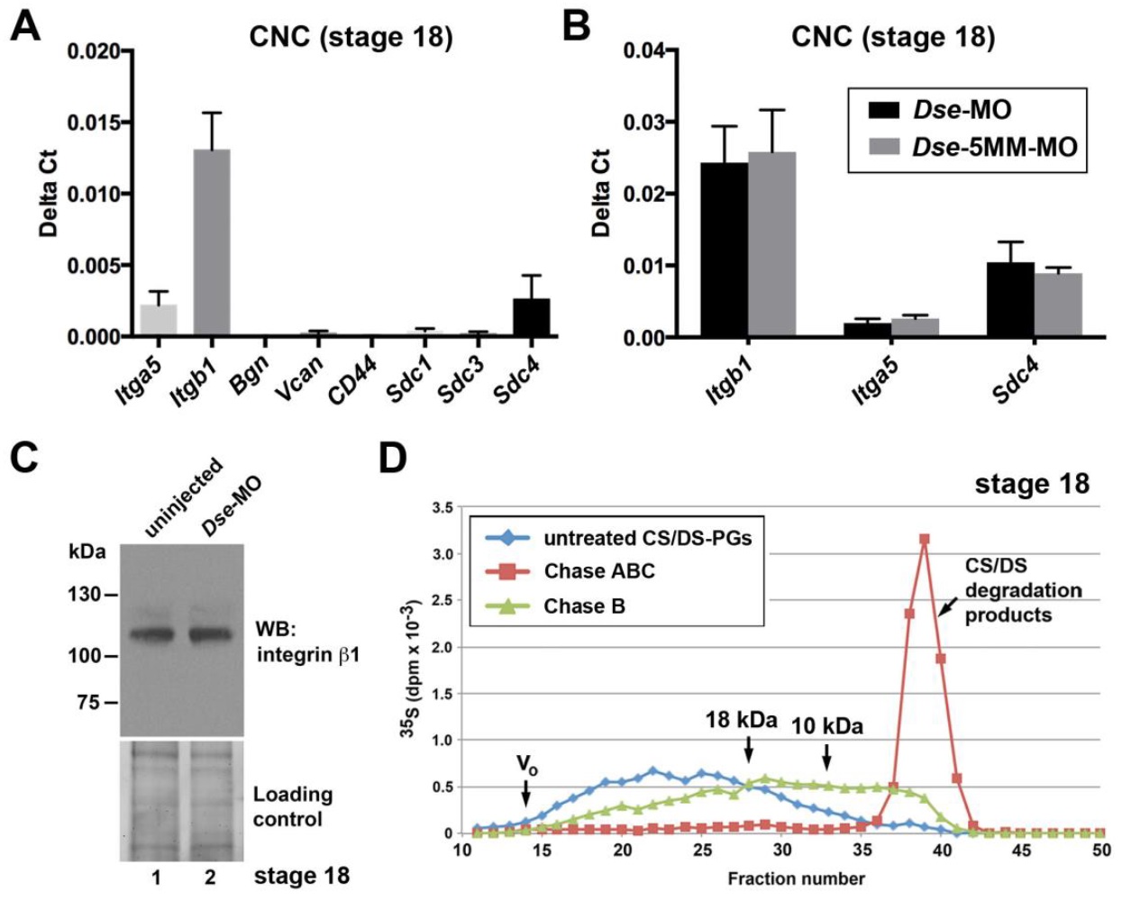 Fig. 7. CS/DS-PGs in CNC cells. (A) qPCR analysis in uninjected CNC explants at stage 18. Note abundant expression of Itga5, Itgb1 and Sdc4. Results are mean±s.d. from triplicates (nâ¥4 biological replicates). (B) Dse-MO does not differentially affect the mRNA levels of Itga5, Itgb1 and Sdc4 compared with Dse-5MM-MO. Results are mean±s.d. (nâ¥4 biological replicates). (C) Dse-MO does not reduce the protein amount of integrin β1 in explants enriched in neural crest and epidermis of stage 18 embryos. Western blotting was performed on a 7.5% Mini-Protean TGX Stain-free gel (Bio-Rad). The loading control was ascertained prior to blotting using the ChemiDoc Touch Imaging System. Resuts is representative of two independent experiments (n=2). (D) Metabolic labeling of PGs in stage 18 CNC explants. Note that Chase B partially degrades CS/DS PGs >18â kDa. The IdoA is a rare modification because the split chains are â¼10â kDa. |