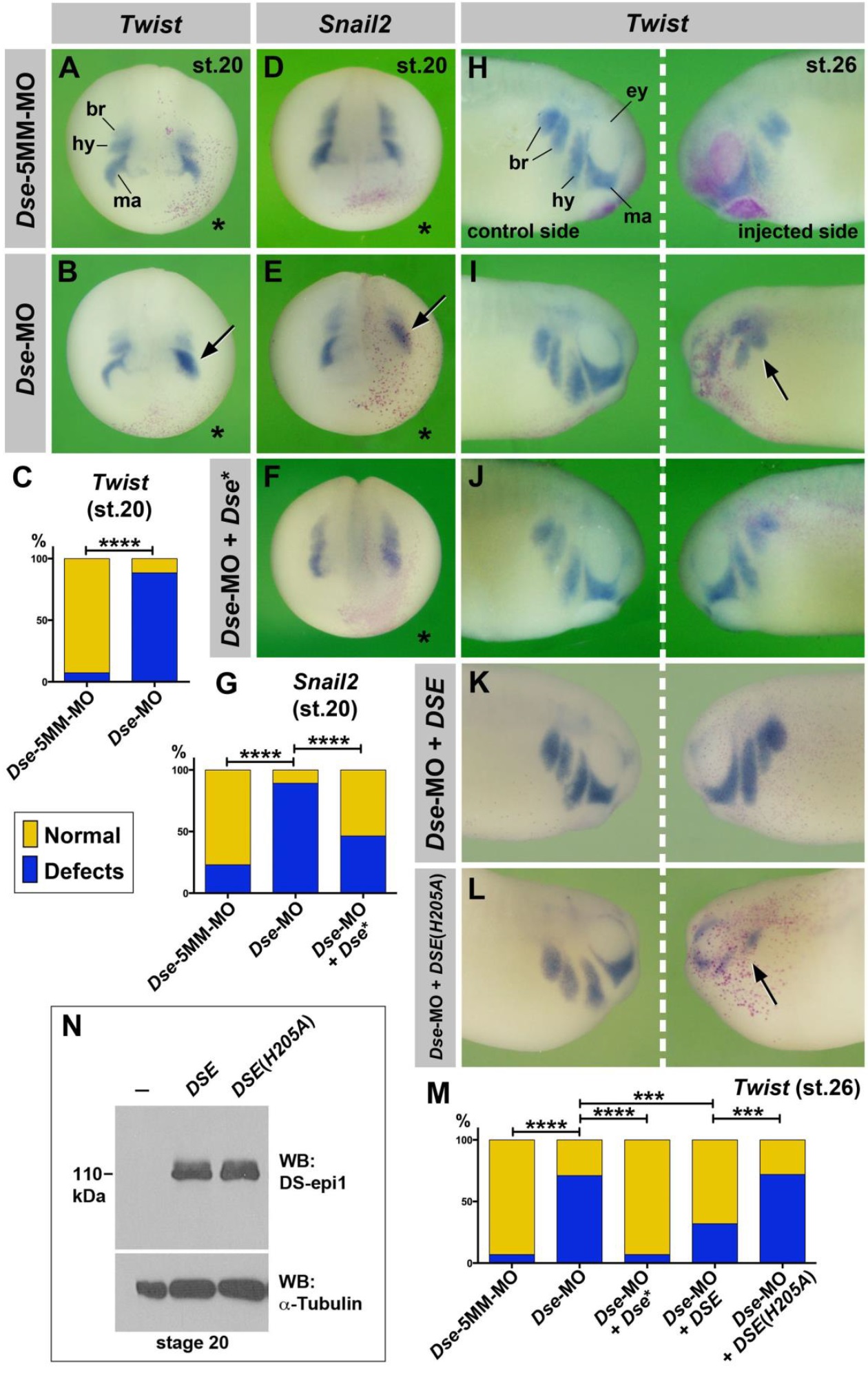 Fig. 5. DS-epi1 regulates CNC cell migration. (A-G) Anterior view of late neurula embryos. The injected side is marked with a star. Dse-MO impairs the segregation of Twist+ and Snail2+ CNC cells (arrows). The effect is reversed by 250â pg Dse* mRNA. A quantification of the percentage of embryos with defects is shown in C and G. (H-M) Lateral view of tailbud embryos. Dse-MO leads to defective migration of Twist+ CNC cells (arrow) on the injected side, which is rescued by the co-injection of 250â pg Dse* mRNA and 25â pg pcDNA3/CTAP-DSE plasmid, but not 25â pg pcDNA3/CTAP-DSE (H205A) plasmid DNA. A quantification of the percentage of embryos with defects is shown in M. (N) Western blot analysis of lysates from embryos injected with 100â pg pcDNA3/CTAP-DSE or pcDNA3/CTAP-DSE (H205A) plasmid DNA and probed for DS-epi1. α-tubulin is a loading control. br, branchial segment; ey, eye; hy, hyoid segment; ma, mandibular segment. The proportion of examined embryos with the indicated phenotype was as follows: A, 15/16; B, 30/34; D, 41/46; E, 50/65; F, 20/37; H, 25/27; I, 31/41; J, 36/44; K, 27/40; and L, 14/18. ***P<0.005; ****P<0.0001 (Fisher's exact test with two-tailed P-value calculation). |