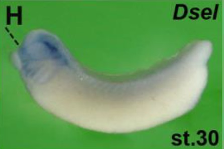 dsel (dermatan sulfate epimerase-like) gene expression in Xenopus laevis embryo, assayed via in situ hybridization, NF stage 30, lateral view, anterior left, dorsal up. |
