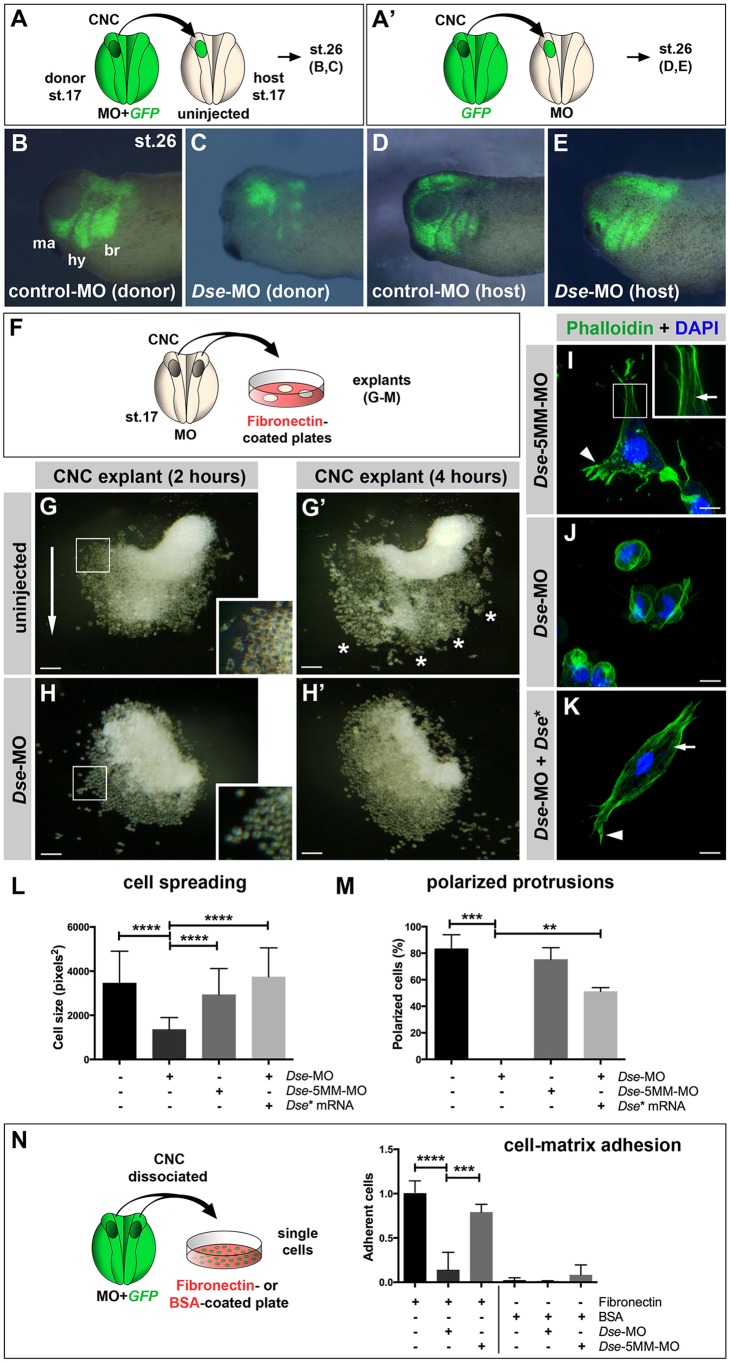 Figure 6. DS-epi1 has a tissue-autonomous role in cranial neural crest cell migration, adherence to fibronectin and cell polarization. (A,Aâ) Schemes for transplantation experiments. A CNC explant from an embryo injected with 300 pg GFP mRNA was homotypically grafted at stage 17. MOs were injected into the donor (A) or host embryo (Aâ). (B-E) Lateral view of embryos at stage 26. Grafted GFP+ CNC cells migrate ventrally when derived from control-MO- (B); however, they do not properly migrate when derived from Dse-MO-injected embryos (C). The CNC cell migration was normal when the host embryo was injected with control-MO or Dse-MO (D,E). Three independent experiments (n=3). (F) Scheme illustrating the culture of stage 17 morphant CNC explants on fibronectincoated plates.(G,Gâ) Two hours after plating (G), the control-MO-injected CNC explant exhibits collective cell migration in one direction (arrow). The inset shows a magnification of spread cells. After 4 hours (Gâ), the cells migrate in distinct streams (stars). (H,Hâ) Cells of Dse-MO-injected CNC explants detach from each other and fail to adhere to the fibronectin substrate. The inset depicts a magnification of the spherical cells. (I-K) Confocal microscopy of fixed CNC cells after 5 hours of explant culture on fibronectin. Phalloidin-488 and DAPI label F-actin and cell nuclei, respectively. The Dse-5MM-MO-injected control cell (I) exhibits lamellipodia at the leading edge (arrowhead) and stress fibers in the inner regions of the cell (arrow in inset). Dsemorphant cells (J) exhibit cortical networks of stress fibers and lack polarized protrusions. Co-injection of Dse-MO and 1 ng Dse* mRNA per embryo (K) restores the normal cytoskeleton and cell shape. (L,M) Quantification of cell spreading (L) and formation of polarized cell protrusions (M) in dissociated single, phalloidin-stained cells of CNC explants following 5 hours of culture on fibronectin. Cell spreading and polarized protrusions were quantified by calculating the cell size as the square number of pixels (ImageJ) and determining the percentage of cells with lamellipodia or filopodia, respectively. Uninjected and Dse- 5MM-MO-injected explants exhibit a similar extent of cell spreading and formation of polarized protrusions. The reduction in the cell size and the lack of lamellipodia and filopodia are rescued by the co-injection of Dse* mRNA in Dse-morphant explants. A minimum of 100 cells per sample were evaluated in each experiment. Number of independent experiments (n=3). (N) Cell-matrix adhesion of dissociated single CNC cells on fibronectin- or BSA coated plates. Following the co-injection of MO and 300 pg GFP mRNA, CNC explants from stage 17 embryos were dissociated in Ca2+/Mg2+-free medium and cultured for 45 min on fibronectin or BSA. The Dse-morphant cells exhibit decreased adhesion to fibronectin compared with the control and Dse-5MM-MO-injected cells. None of the analyzed cell samples exhibited significant cell adhesion to BSA. At least three independent experiments for each sample (n=3).BSA, bovine serum albumin. Indicated phenotypes are shown as follows: B, 10/12; C, 11/13; D, 7/7; E, 9/9; G, 30/34; H, 26/28. The scale is 100 um in G-Hâ and 10 um in I-K. Statistical significance was determined using ordinary one-way ANOVA multiple comparisons test with Tukey correction**, p<0.01, ***, p<0.001, ****, p<0.0001. |