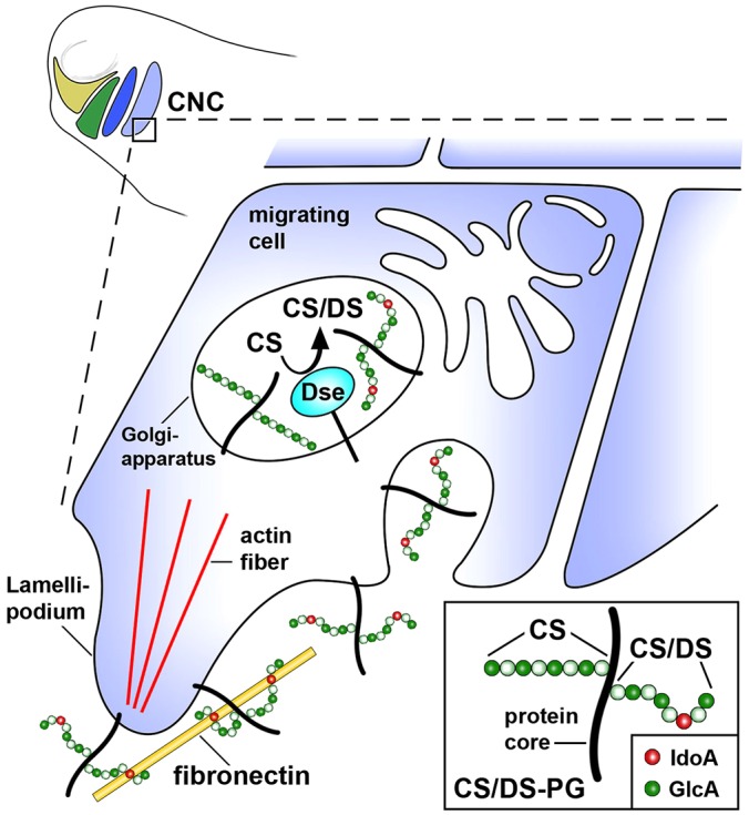 Fig. 8. Model for the stimulation of CNC cell migration by CS/DS PGs in a post-neurula embryo. DS-epi1 converts GlcA into isolated IdoA residues on CS/DS PGs. The interaction between CS/DS PGs and extracellular fibronectin stimulates cytoskeletal rearrangement and polarized cell migration. |