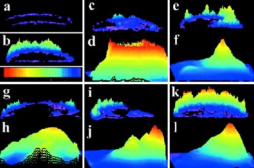Figure 2. XDshΔDIX activates Ca2+ flux in a PTX-insensitive manner. Zebrafish embryos were injected with a Ca2+-sensitive dye along with respective RNAs and subjected to image analysis. In all panels, the image corresponds to the outline of a zebrafish embryo, depicting the spatial distribution of Ca2+ flux or lineage tracers as noted. (a) Control Ca2+ flux and (b) Rfz2 RNA–induced Ca2+ flux are low and high reference points, respectively (purple denotes low Ca2+ flux, and blue, green, yellow, and red denote increasing Ca2+ flux, respectively, as shown in the bar below b). (c) Unilateral injection of wild-type XDsh RNA produces a mild increase in Ca2+ transients compared with the control, a. (d) Lineage tracer coinjected with wild-type XDsh RNA establishes the spatial distribution of RNA after injection. (e) Injection of XDshΔDIX RNA produces a significant increase in Ca2+ transients in the region of f, the lineage tracer for XDshΔDIX RNA injection. (g) Ca2+ transients (blue) in embryos uniformly injected with Rfz2 RNA are reduced in regions expressing the A protomer of PTX comixed with lineage tracer, as seen in h. (i) Ca2+ transients in embryos uniformly injected with XWnt-5A RNA are similarly reduced in PTX-injected regions; PTX and tracer distribution shown in j. (k) Unilateral injection of XDshΔDIX RNA produces a significant increase in Ca2+ transients not blocked by PTX, with the spatial distribution of PTX shown in l.