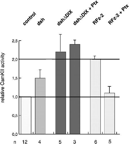 Figure 3. XDshΔDIX activates CamKII activity in a PTX-insensitive manner. Two-cell-stage Xenopus embryos were injected with RNAs encoding Rfz2, XDsh–GFP, XDshΔDIX–GFP, or PTX and processed for an in vitro CamKII activity assay. Injection of wt XDsh–GFP RNA produces a mild increase in CamKII activity compared with control embryos, whereas Rfz2 and XDshΔDIX–GFP RNAs produce a twofold activation compared with control embryos. Activation of CamKII by XDshΔDIX–GFP, unlike Rfz2, was not sensitive to coexpression of PTX. CamKII is rarely induced above two to threefold in any system (for review see Kühl et al., 2000a).