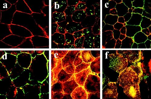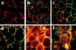 Figure 4. Expression of the DEP domain of XDsh interferes with Xfz7-mediated activation of PKC. Two-cell-stage Xenopus embryos were injected with RNAs encoding XPKCα–myc (0.5–1 ng) and Xfz7 (0.5–1 ng) plus XDsh–GFP (0.5–1 ng), XDshΔDEP–GFP (0.5–1 ng), XDshΔDIX–GFP (0.5–1 ng), XDshΔPDZ–GFP (0.5–1 ng), XDEP–GFP (0.5–1 ng), and/or LacZ (as a control for normalizing levels of injected RNA, 0–4 ng) and cultured to stage 8, and animal caps were explanted. (a) XPKC (red) is localized to the plasma membrane when coexpressed with untagged Xfz7. (b) XDshΔDEP–GFP (green) and (c) XDshΔPDZ–GFP (green) do not block Xfz7-mediated membrane translocation of XPKC (red). (d) Both wt XDsh–GFP (green) and XPKC (red, yielding some yellow signal in areas of overlap with XDsh) are recruited to the plasma membrane upon coexpression of untagged Xfz7. (e) Expression of XDEP–GFP reduces membrane relocalization of XPKC by untagged Xfz7 (note increased red cytoplasmic XPKC signal compared with panel a), whereas XDEP–GFP itself is recruited to the plasma membrane by Xfz7 (green signal, appearing yellow at the membrane due to overlap with the red signal). (f) In the absence of ectopic Xfz7, XPKC (red) is localized throughout the cytoplasm, and XDEP–GFP (green) is localized diffusely throughout the cytoplasm (yellow denotes areas of overlapping signal).