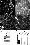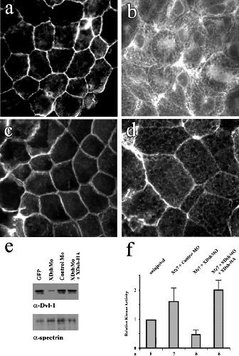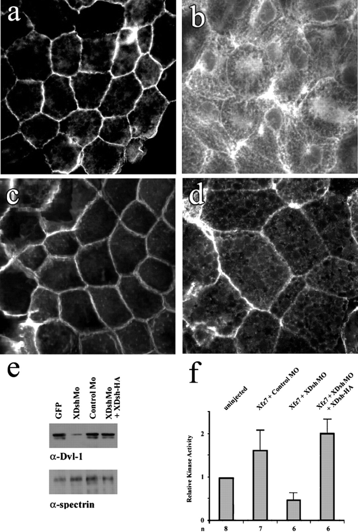 Figure 5. XDshMO blocks activation of PKC by Xfz7. Fertilized Xenopus eggs were injected with XDshMO (4â8 ng) or control MO (4â8 ng MoZNLK), plus RNAs encoding Xfz7 (0.5â1 ng), XDshâHA (0.5â1 ng), XPKCαâmyc (shown in panels aâd, 0.5â1 ng), and/or GFP (as a control to normalize RNA levels, 0â2 ng) and cultured to stage 8, and animal caps were explanted. (a) Xfz7 activates membrane translocation of XPKC (white signal). (b) Injection of XDshMO inhibits Xfz7-mediated membrane translocation of XPKC (note increased cytoplasmic signal compared with panel a). (c) A control MO does not inhibit membrane translocation of XPKC by Xfz7. (d) The effects of XDshMO can be rescued by injecting XDsh RNA that does not contain the 5â² UTR targeted by the MO (compare increased membrane staining of XPKC with the XPKC signal in panel b). (e) Western blots from animal cap lysates show that XDshMO reduces XDsh levels below that of GFP- or control MO-injected caps when probed with an anti-Dsh antibody (antiâ Dvl-1). Coinjection of XDshâHA RNA and XDshMO brings XDsh levels back to those of control animal caps, whereas expression of a control protein, spectrin, is not altered by any injection. (f) Lysates from animal caps were processed for an in vitro PKC activity assay, and a representative experiment is shown. Injection of XDshMO reduces XPKC activity below that of control MO-injected caps, and this activity is rescued by coinjection of XDshâHA RNA.