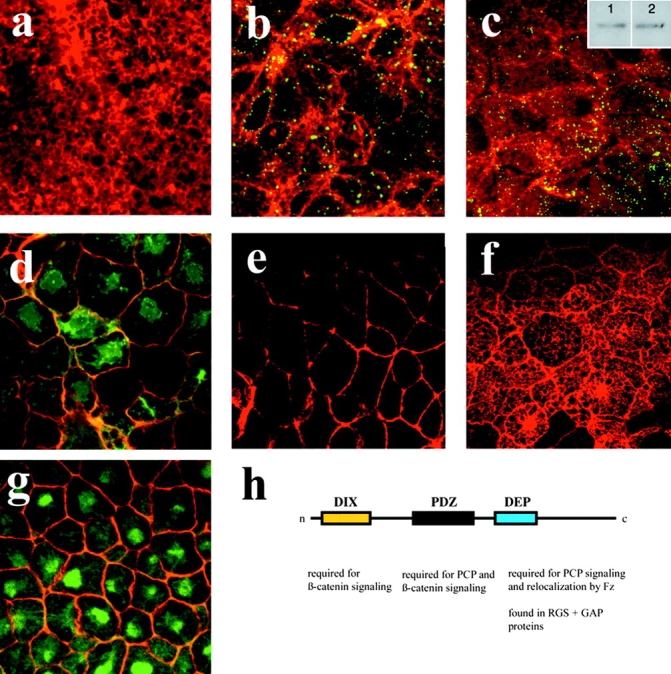 Figure 1. XDshΔDIX activates PKC in a PTX- insensitive manner. Two-cell-stage Xenopus embryos were injected with RNAs encoding XPKCα–myc (0.5–1 ng) plus XDsh–GFP (0.5–1 ng), XDshΔDEP–GFP (0.5–1 ng), XDshΔDIX–GFP (0.5–1 ng), Rfz2 (0.5–1 ng), PTX (1–2 ng), and/or LacZ (as a control for normalizing levels of injected RNA, 0–4 ng) and cultured to stage 8, and animal caps were explanted. (a) XPKC (red) is localized primarily in the cytoplasm under control conditions. (b) Ectopic XDsh–GFP (green), which is localized to punctate structures, is relatively weak at activating translocation of XPKC (red) to the membrane. (c) XDshΔDEP–GFP (green) as well as XDshΔPDZ–GFP (not depicted) do not activate XPKC (red) membrane translocation. (c, inset) XDsh–GFP (lane 1) and XDshΔDIX–GFP (lane 2) are expressed equally, as detected by an anti-GFP Western blot. Although the protein in lane 2 migrates more rapidly on gels compared with lane 1 (not depicted), it is aligned with lane 1 to facilitate the comparison of signal intensities. (d) Expression of XDshΔDIX–GFP (green) activates translocation to the membrane of PKC (red). (e) Rfz2 (untagged) activates membrane translocation of XPKC (red). (f) Rfz-2–mediated membrane translocation of XPKC (red) is partially blocked by PTX. (g) The ability of XDshΔDIX–GFP (green) to induce membrane translocation of XPKC (red) is not blocked by PTX. (h) A schematic representing the three domains of Dsh discussed in the text.