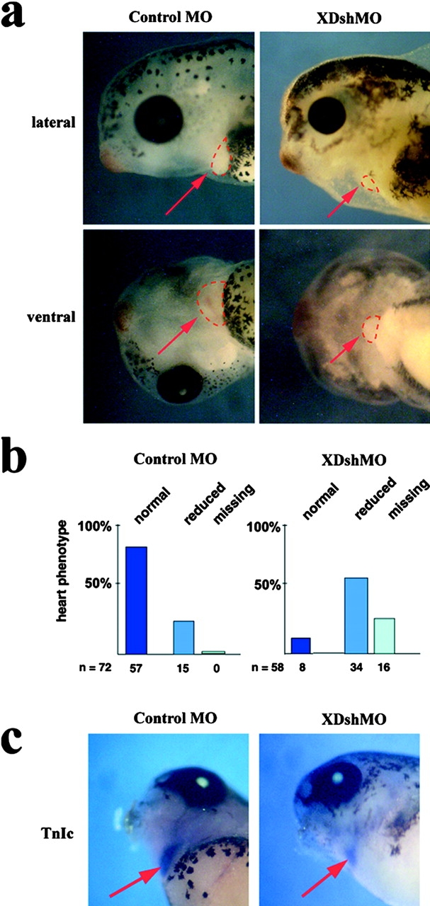 Figure 6. Dsh is required for Xenopus heart development: effect of XDshMO on cardiac development. (a) Vegetal blastomeres of Xenopus eight-cell embryos were injected with a total of 50 ng of XDshMO or control MO, and the development of the heart was analyzed at stage 41–43 for a contractile phenotype. Lateral and ventral views of representative injected embryos are given. The contracting areas are indicated by the dashed red line and by a red arrow. (b) Summary of phenotypes of injected embryos. n represents the number of injected embryos and, below the bars, the number of embryos with the indicated heart phenotype. (c) Whole mount in situ hybridization against TnIc reveals weaker staining in XDshMO-injected embryos in comparison with embryos injected with the control MO.